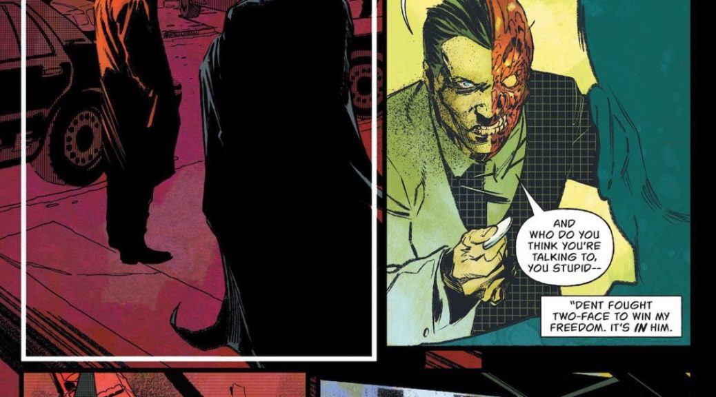 But that’s the thing about trusting reformed villains: we never know how much their darker side is still lurking in the shadows. Harvey’s ultimate plan isn’t as downright evil as Riddler’s, but where it lacks in scale, it makes up for in its emotional gut-punch. Two-Face isn’t out to destroy the city or Batman or to a rival gang, but seek a kind of emotional vengeance on his father. As with Batman/Bruce Wayne himself, this series seems to be playing into the sins of the father as a major theme in its issues so far. The only problem is that Harvey’s deep-seeded problems with his father aren’t explored as much as they probably should be. Was he a hard-ass on Harvey? Was he absent throughout much of his childhood? Did he disappoint Harvey at some point? Some clues are given, but given Two-Face’s ultimate reveal, I would have liked to have seen this aspected expanded upon a little more.