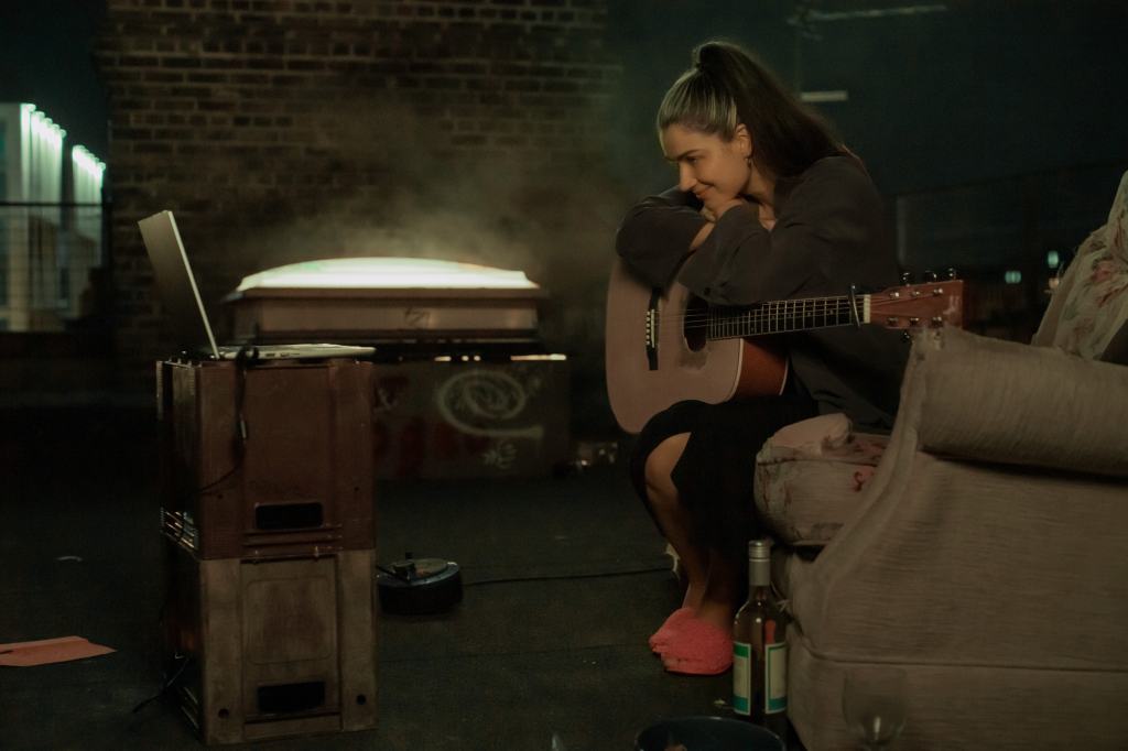In fact, Flora (Eve Hewson) has no musical career aspirations – she simply finds a guitar in a dumpster and learns to play it after her teenage son Max (newcomer Oren Kinlan) turns it down. After combing through the internet for a suitable tutor, she lands on Jeff’s (Joseph Gordon-Levitt) page, and the two strike up an unlikely but friendly relationship. Hewson and Gordon-Levitt’s chemistry together works wonders for the film, in spite of them mostly speaking via Zoom (he lives in Los Angeles). He’s more interested in teaching her the philosophy of music, and what makes it perfect for expressing oneself. She’s more interested in his looks.
