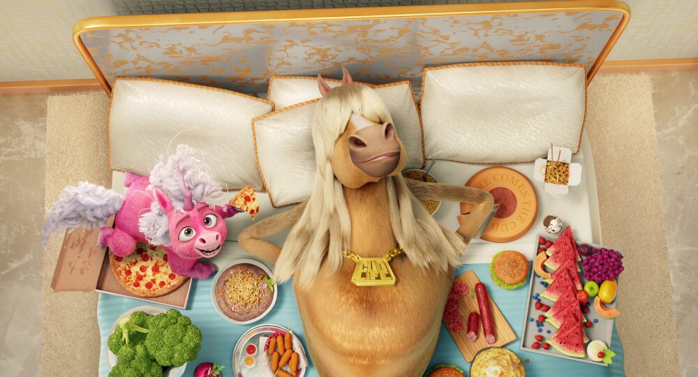 In a Bojack Horseman-esque world where humans and talking animals coexist and become celebrities, Thelma the Unicorn follows Thelma (Brittany Howard), who is not, in fact, a unicorn. She’s actually a simple farm pony whose daily routine mostly consists of hauling manure. She dreams of making it big as a musician with her band-mates Otis the donkey (Will Forte) and Reggie the llama (John Heder), and making it to something called Sparklepalooza. Within the first 10 minutes, after Thelma’s band is rejected because they simply don’t have “the look”, you’ll understand where the film is going and what the ultimate message is.